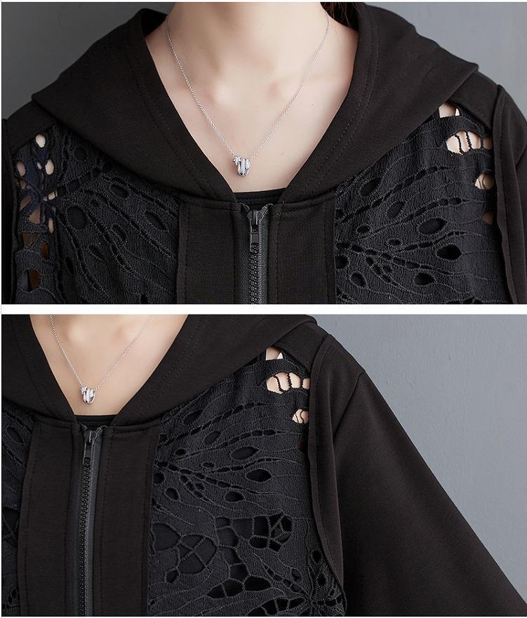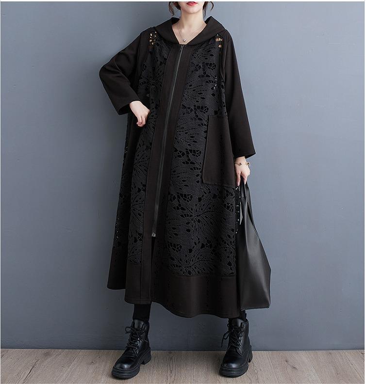 大きいサイズ レディース ロングコート レース パーカー 春 秋冬 新品 長袖 フード アウター ブラック ジップ