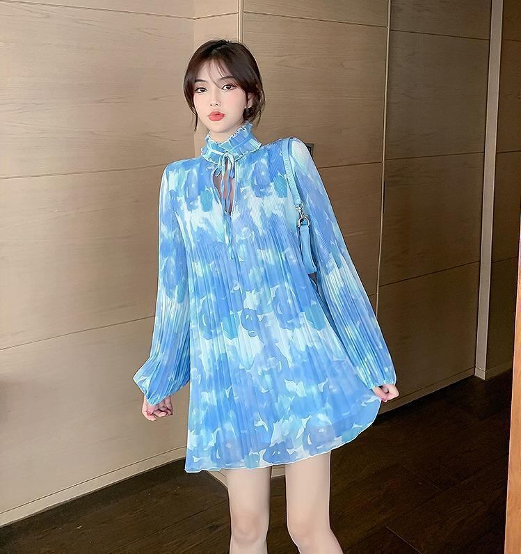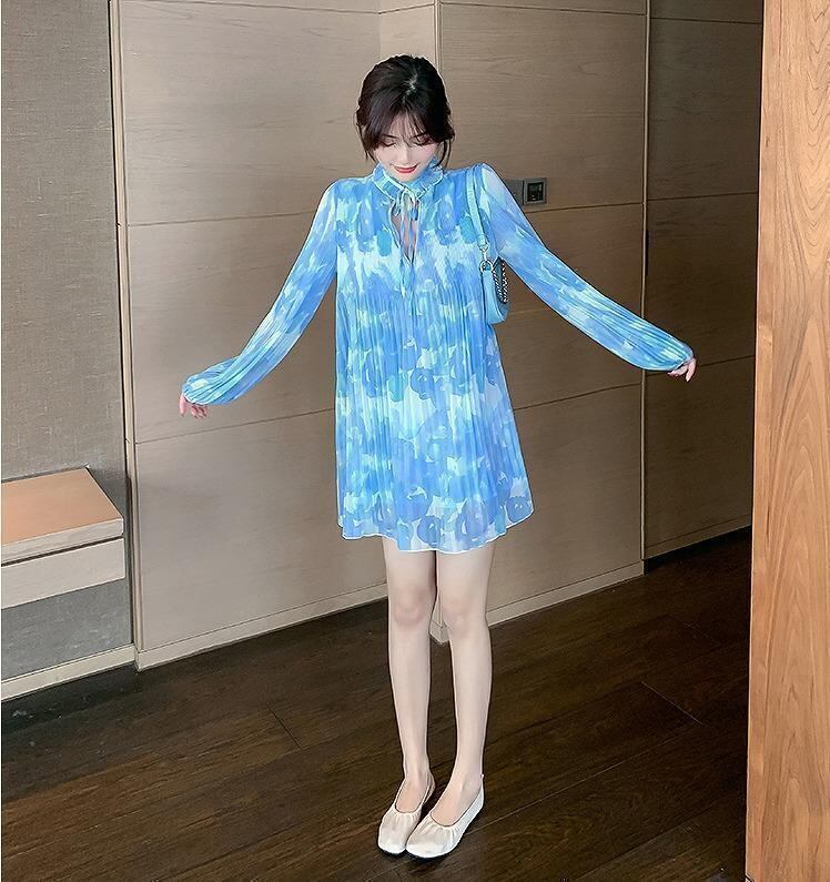 大きいサイズ レディース ワンピース 長袖 ブルー プリーツ