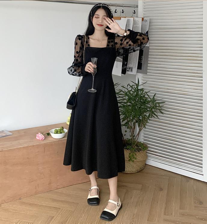 大きいサイズ レディース 秋冬 シースルー袖 ワンピース ドット柄 長袖